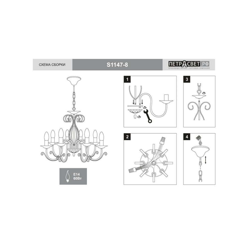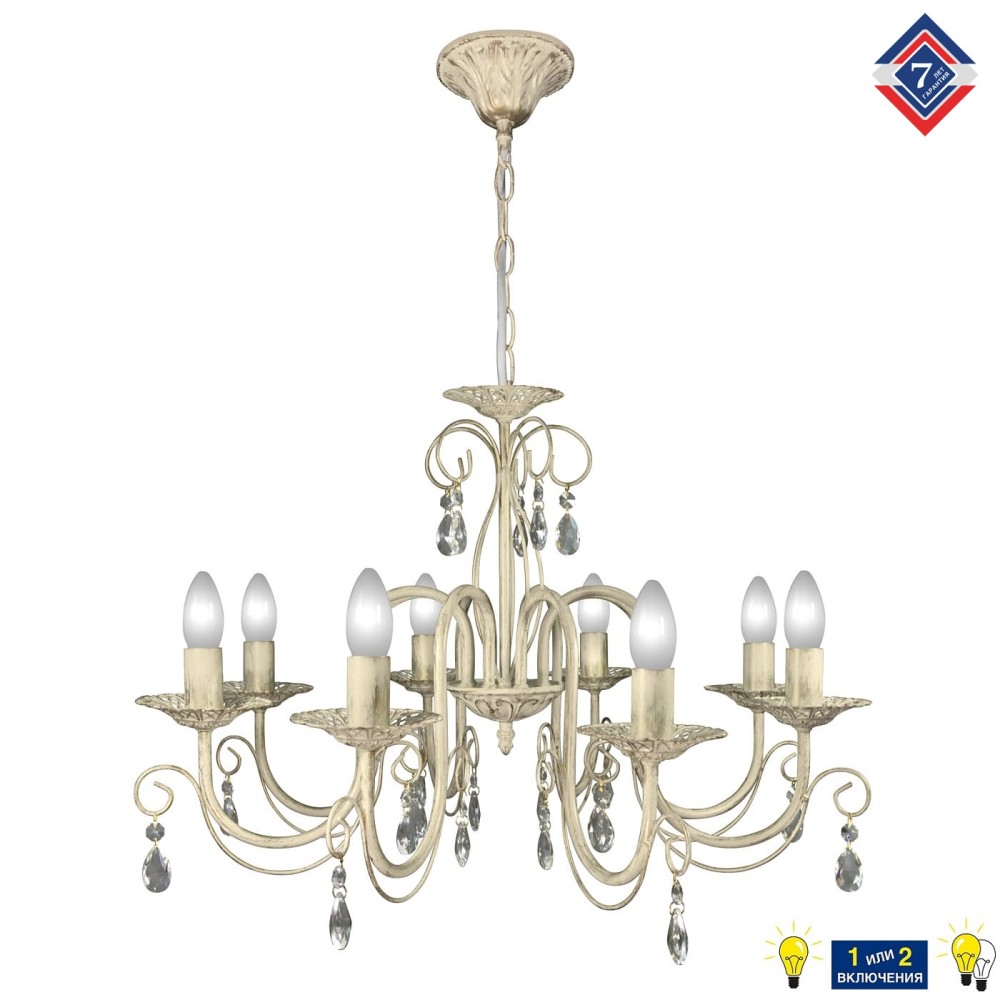 Люстра ПЕТРАСВЕТ S1147 – Великолепие Неоклассики с Хрусталем (8 ламп) Эта роскошная люстра от бренда ПЕТРАСВЕТ – идеальное решение для создания атмосферы элегантности и уюта в вашем доме. Предназначенная для помещений с площадью от 24 до 35 квадратных метров, этот неоклассический светильник станет настоящим центром внимания, подчеркивая красоту интерьера и наполняя пространство теплым, рассеянным светом. Превосходное сочетание дизайна и функциональности Люстра S1147 – это гармоничное сочетание классической элегантности и современных технологий. Ее неоклассический стиль, вдохновленный вековыми традициями, дополнен использованием высококачественных материалов и продуманной конструкции. ПЕТРАСВЕТ, российский производитель, славящийся своим опытом и вниманием к деталям, предлагает вам светильник, который прослужит долгие годы, радуя своим безупречным внешним видом и надежной работой. Роскошный внешний вид: детали, которые делают разницу Материалы: Корпус люстры выполнен из металла, окрашенного в элегантный белый цвет с патиной золота. Эта комбинация создает эффект глубины и благородства, а также придает светильнику уникальный, неповторимый вид. Хрустальные подвески: Восемь изящных хрустальных подвесок, расположенных на металлическом каркасе, отражают и преломляют свет, создавая волшебный, мерцающий эффект. Каждый кристалл тщательно отполирован, чтобы обеспечить максимальную прозрачность и блеск. Стиль: Люстра идеально впишется в интерьеры в стилях неоклассика, прованс и классика. Ее элегантный дизайн будет уместен в гостиных, столовых, спальнях и других помещениях, где требуется создание атмосферы роскоши и уюта. Патиновая золотая отделка: Придает светильнику глубину и богатство, создавая ощущение старины и благородства. Патинирование – это техника обработки металла, которая придает поверхности состаренный вид, имитируя эффект старинного покрытия. Цвет: Белый цвет корпуса и золотая патина создают гармоничное сочетание, которое не перегружает интерьер, а наоборот, подчеркивает его красоту. Технические характеристики – надежность и функциональность Мощность: Люстра рассчитана на использование ламп накаливания, светодиодных или люминисцентных. Универсальность типа используемых ламп позволяет подобрать оптимальное решение для ваших потребностей и бюджета. Тип цоколя: Е14 – стандартный тип цоколя, который легко найти и заменить. Напряжение: 220 В – стандартное напряжение в большинстве бытовых электросетей. Световой поток: 6000 лм – обеспечивает достаточное освещение для помещений площадью до 35 квадратных метров. Размеры: Ширина основания: 12 см – обеспечивает устойчивость светильника. Ширина: 68 см – обеспечивает достаточное пространство для размещения ламп и хрустальных подвесок. Высота: 57-74 см – позволяет регулировать высоту светильника в зависимости от высоты потолка и личных предпочтений. Размеры коробки: 30 x 32 x 31 см – удобны для транспортировки и хранения. Тип монтажа: Подвесной – простой и быстрый монтаж. Крепление: Крюк – обеспечивает надежное крепление к потолку. Гарантия: 7 лет – доказательство высокого качества продукции и уверенности производителя в своих изделиях. Преимущества люстры ПЕТРАСВЕТ S1147: Роскошный дизайн: Неоклассический стиль с использованием хрусталя и патинированной отделки. Выс